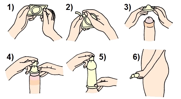 Sbalený kondom položíme na koneček penisu. Jednou rukou uchopíme rezervoár. To je takový výběžek, který se nachází uprostřed sbaleného kondomu. Pomocí druhé ruky kondom postupně rozbalujeme, a tím zároveň natahujeme na penis (4. - 5.). Postupně kondom rozbalíme tak daleko, kam až kondom dosáhne (5). Přitom jednou rukou stále držíme rezervoár. Když je kondom natažen, zůstane na jeho konci volný (prázdný) rezervoár, který slouží k zachycení spermatu během pohlavního styku (6.).